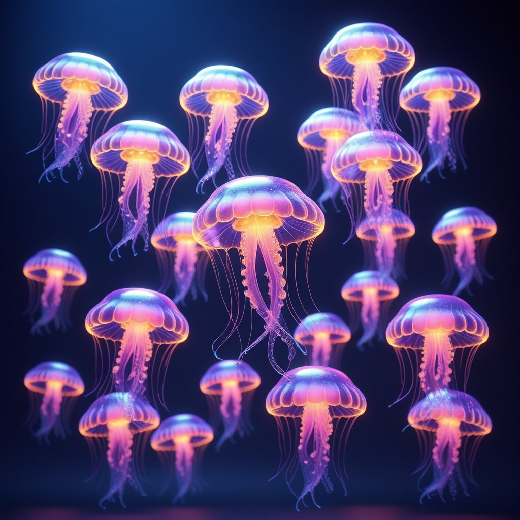 A mesmerizing swarm of glowing neon jellyfish gracefully floating in the digital abyss. Their radiant tendrils pulse with ethereal energy, symbolizing the harmony between nature and futuristic technology.