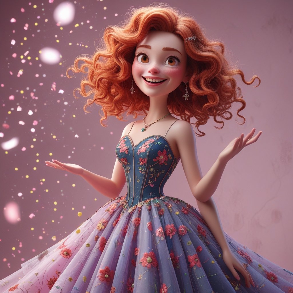 A radiant young woman with fiery red curls dances gracefully amidst a shower of delicate petals. Her exquisite floral gown shimmers with intricate embroidery, blending seamlessly into the soft pink background. With a warm, joyful smile, she embodies the spirit of nature, beauty, and celebration. This NFT captures a moment of pure magic, where elegance meets enchantment.