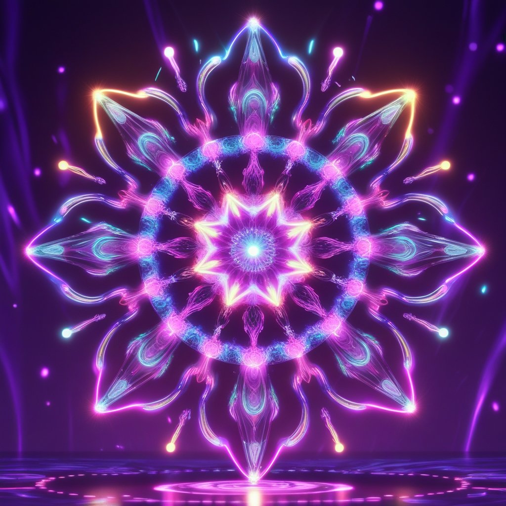 A hypnotic digital artwork showcasing a radiant neon mandala, pulsating with vibrant energy in shades of pink, blue, and gold. This intricate, symmetrical design embodies cosmic balance and spiritual transcendence, merging futuristic aesthetics with ancient sacred geometry. A perfect NFT for collectors who appreciate mesmerizing, meditative, and visionary digital art.