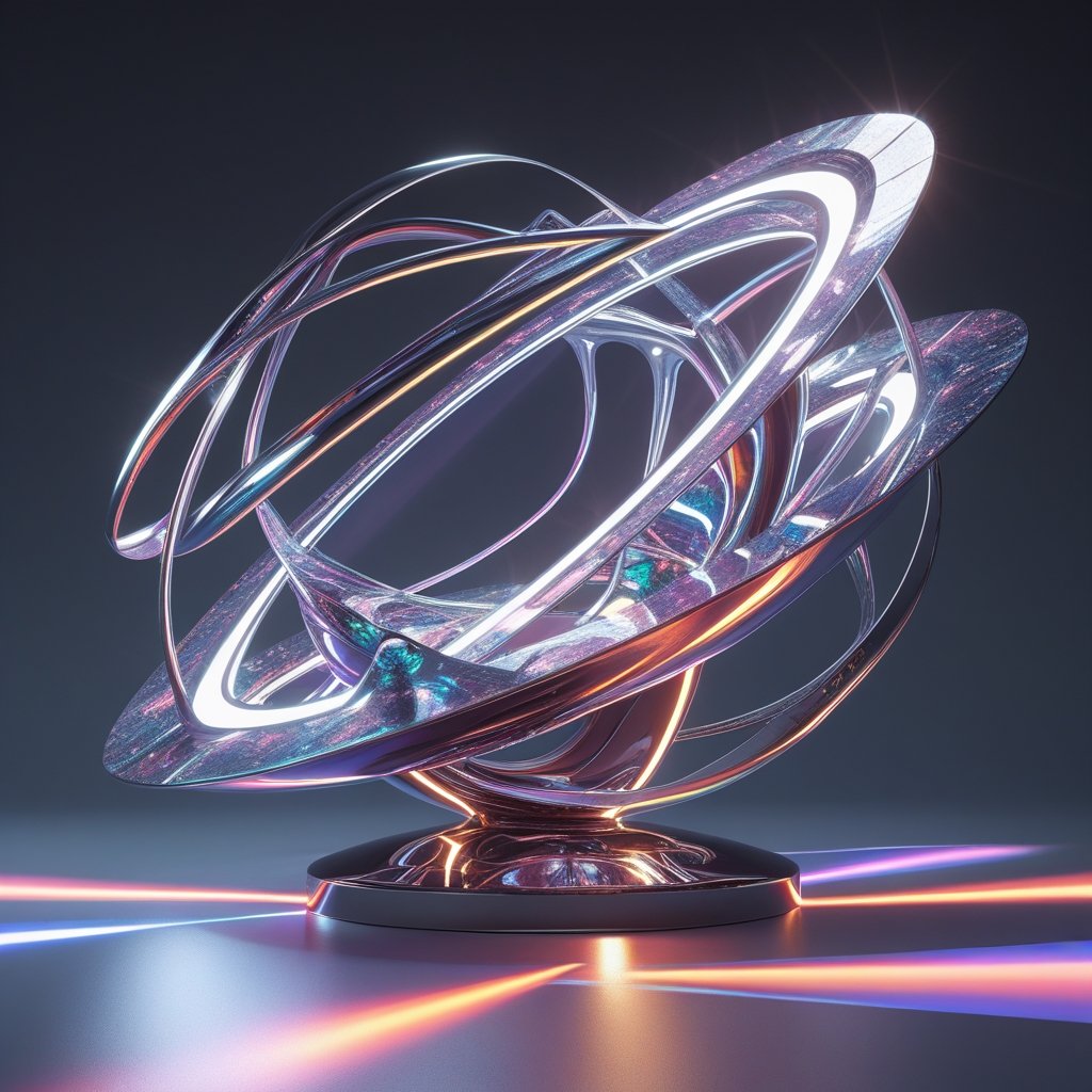 A mesmerizing digital artwork featuring an intricate metallic structure of interwoven, glowing rings, resembling a futuristic orbital mechanism. The reflective surfaces shimmer with iridescent hues, while neon light streaks dance across the base, creating a cosmic, high-tech aesthetic. This NFT is perfect for collectors who appreciate sci-fi-inspired minimalism and celestial symmetry.