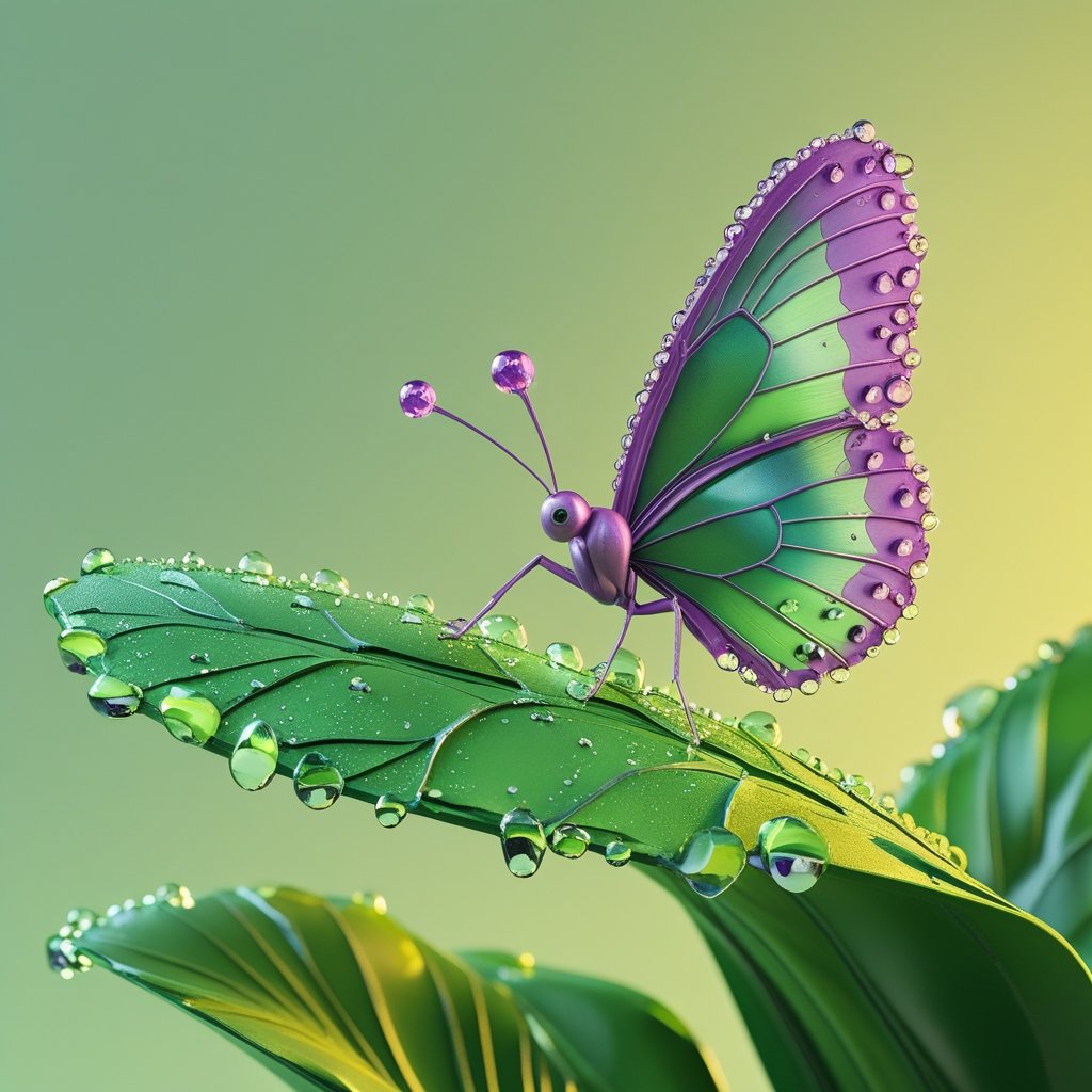 A breathtaking close-up of a vibrant butterfly with delicate glass-like wings, resting on a dewdrop-covered leaf. The intricate details and soft lighting create a mesmerizing fusion of nature and fantasy.