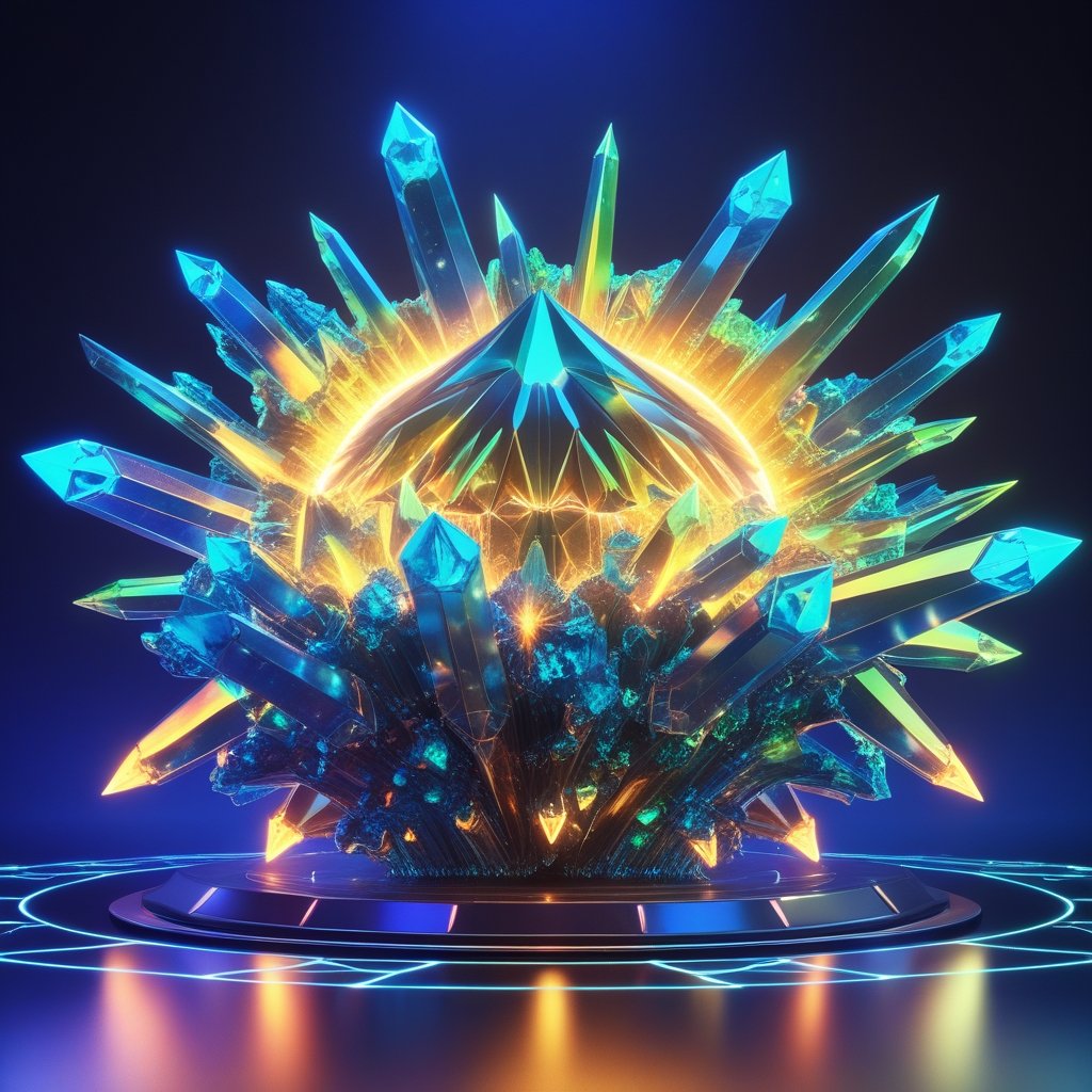 A mesmerizing digital artwork depicting a radiant crystalline structure pulsating with golden and neon-blue energy. Resembling an otherworldly power source, this futuristic artifact is surrounded by glowing circuits, hinting at its cosmic significance. This NFT is perfect for collectors who appreciate mystical energy, sci-fi aesthetics, and digital opulence.