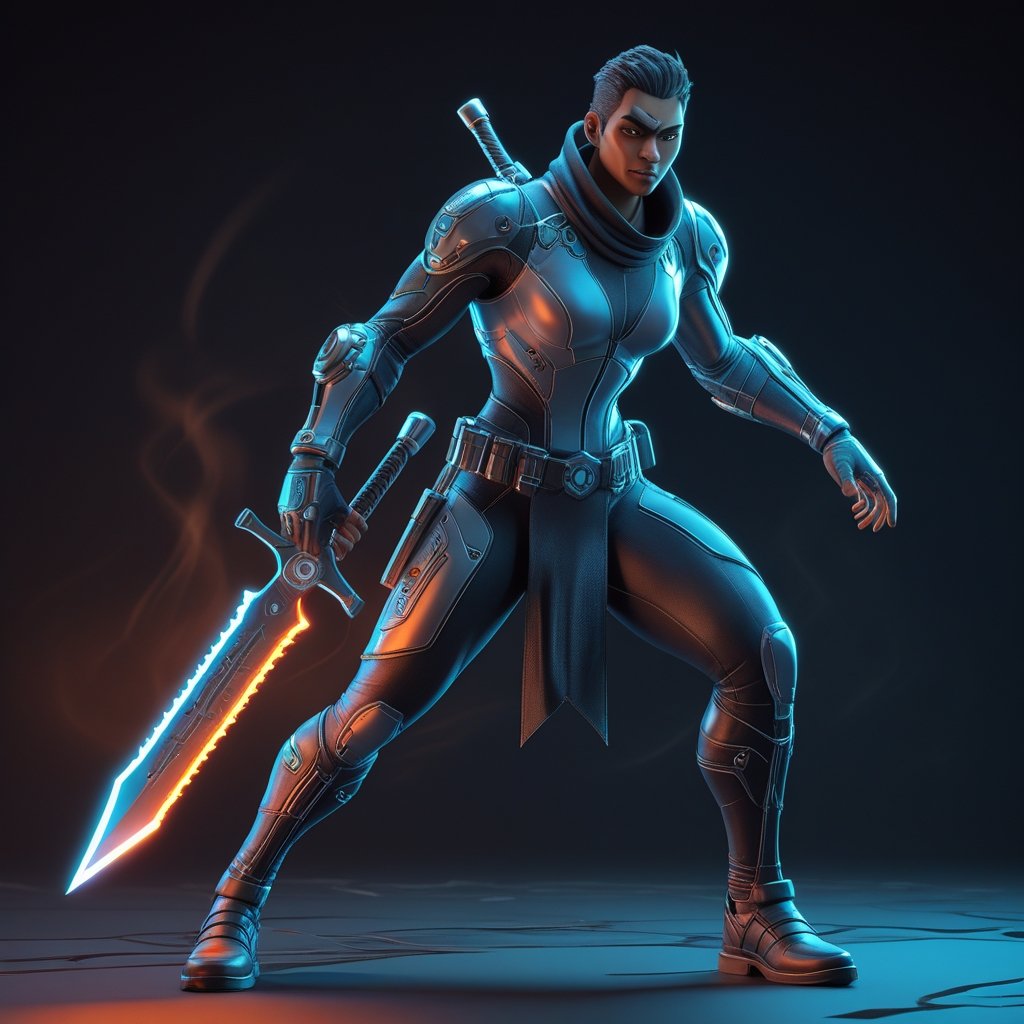 A fearless futuristic swordsman, clad in high-tech armor, wielding a glowing plasma blade. With unmatched skill and unwavering determination, he stands as a lone guardian in the digital battlefield.