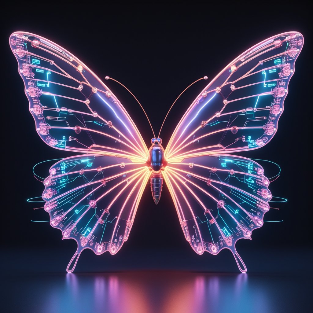 A mesmerizing fusion of nature and technology, this neon-lit cybernetic butterfly symbolizes the harmony between the organic and the digital. Its intricate circuit wings glow with futuristic energy, creating a stunning vision of evolution in the metaverse.