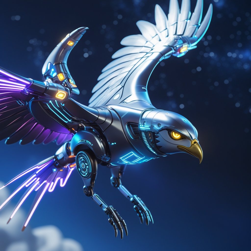 A majestic cybernetic falcon soars through the digital night, its metallic wings pulsating with neon energy. A fusion of nature and technology, this futuristic creature symbolizes power, precision, and the limitless possibilities of AI-driven evolution.