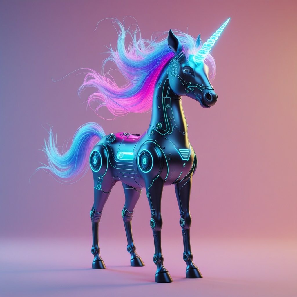 A perfect fusion of fantasy and technology, this cybernetic unicorn stands as a symbol of futuristic wonder. Its glowing neon circuits and flowing digital mane radiate an aura of mystery, bridging the realms of magic and artificial intelligence.