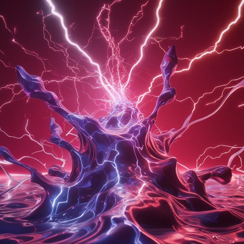 A powerful burst of neon lightning surging through a liquid metallic surface, creating an electrifying fusion of energy and motion. This generative masterpiece captures the raw intensity of digital chaos and creation.