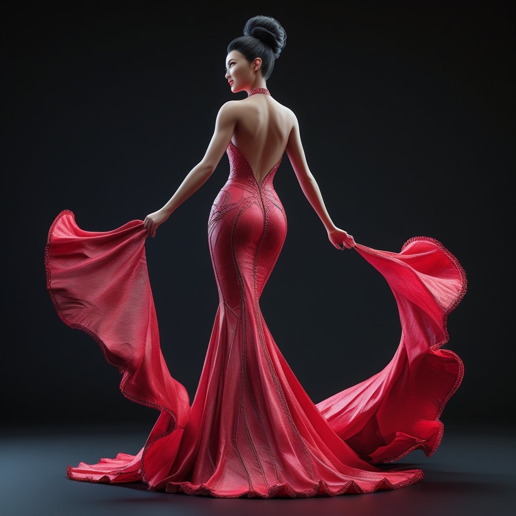 A stunning display of grace and sophistication, this artwork captures a woman in a mesmerizing red gown that flows like liquid fire. The intricate details of the dress highlight her poise, making this piece a symbol of beauty and power.