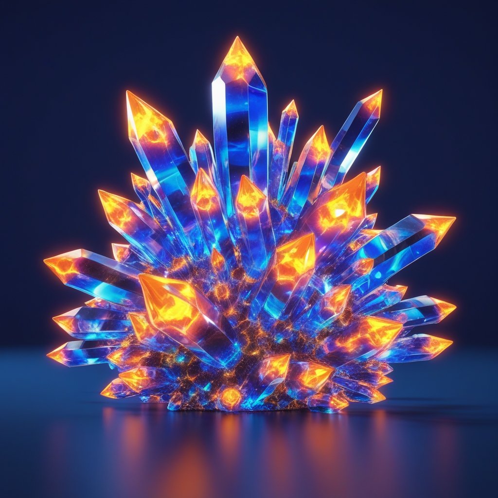 A mesmerizing fusion of fire and ice, this glowing crystal formation radiates with dual energy. The sharp blue edges contrast with the fiery orange cores, symbolizing the balance of extremes in a futuristic digital world.