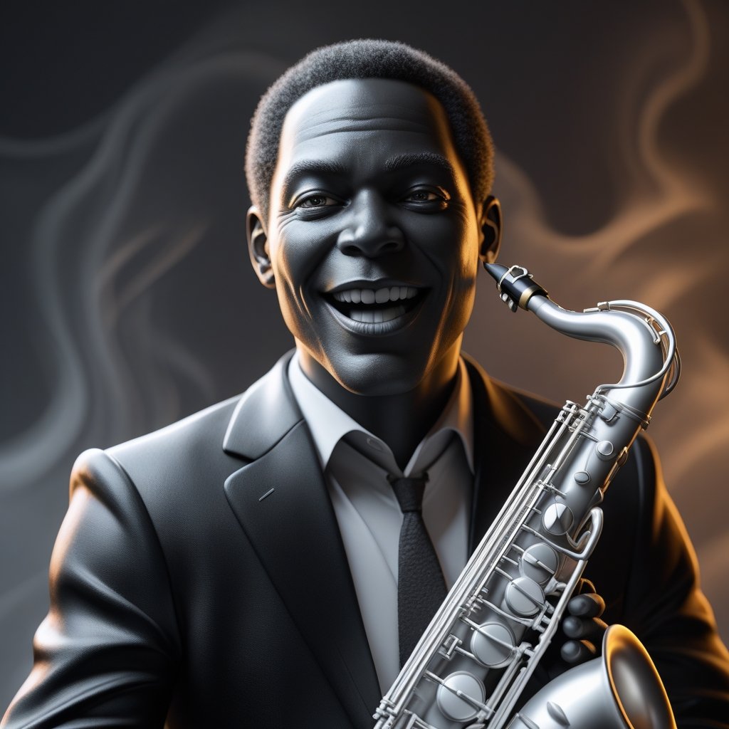 A striking black-and-white portrait of a jazz musician lost in the rhythm of his saxophone. The smoky ambiance and elegant suit capture the raw emotion and timeless essence of jazz.