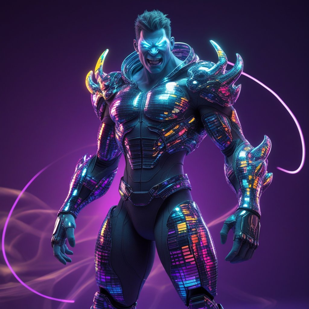 A fierce cybernetic warrior clad in glowing digital armor radiates raw power and dominance. His eyes burn with electric intensity, embodying the strength of technology-driven evolution and the unstoppable force of the digital age.