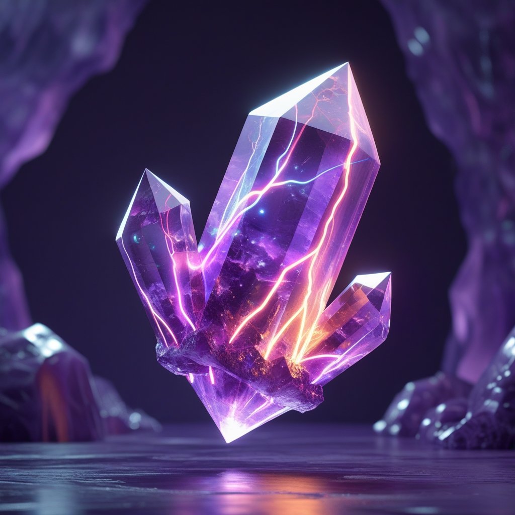 A powerful glowing crystal infused with electric energy, radiating vibrant neon light in the depths of a mysterious cave. This artifact represents the fusion of nature’s raw energy and futuristic technology.