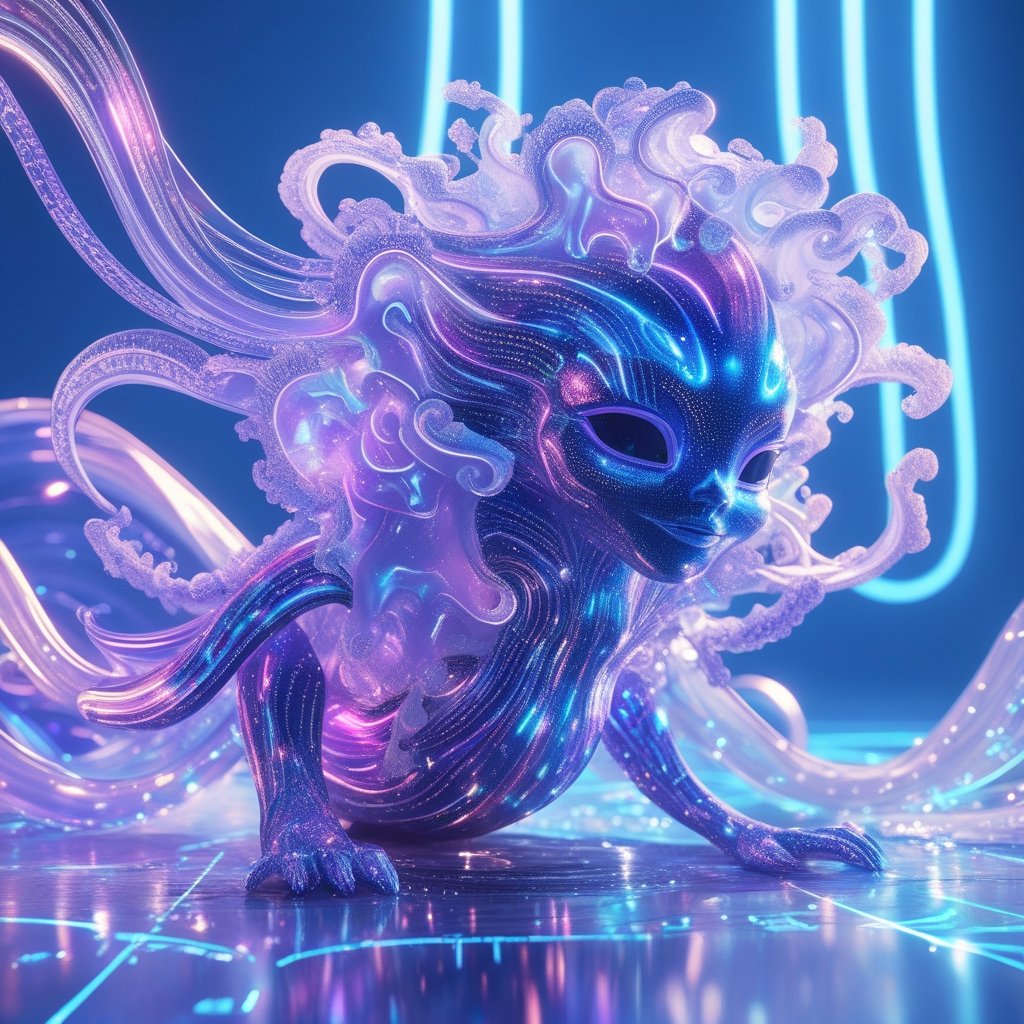 A mystical digital creature infused with cosmic energy, glowing with an ethereal blend of neon and stardust. Its flowing form shimmers with holographic textures, embodying the spirit of the digital realm. This NFT represents magic, evolution, and the fusion of nature with futuristic design.