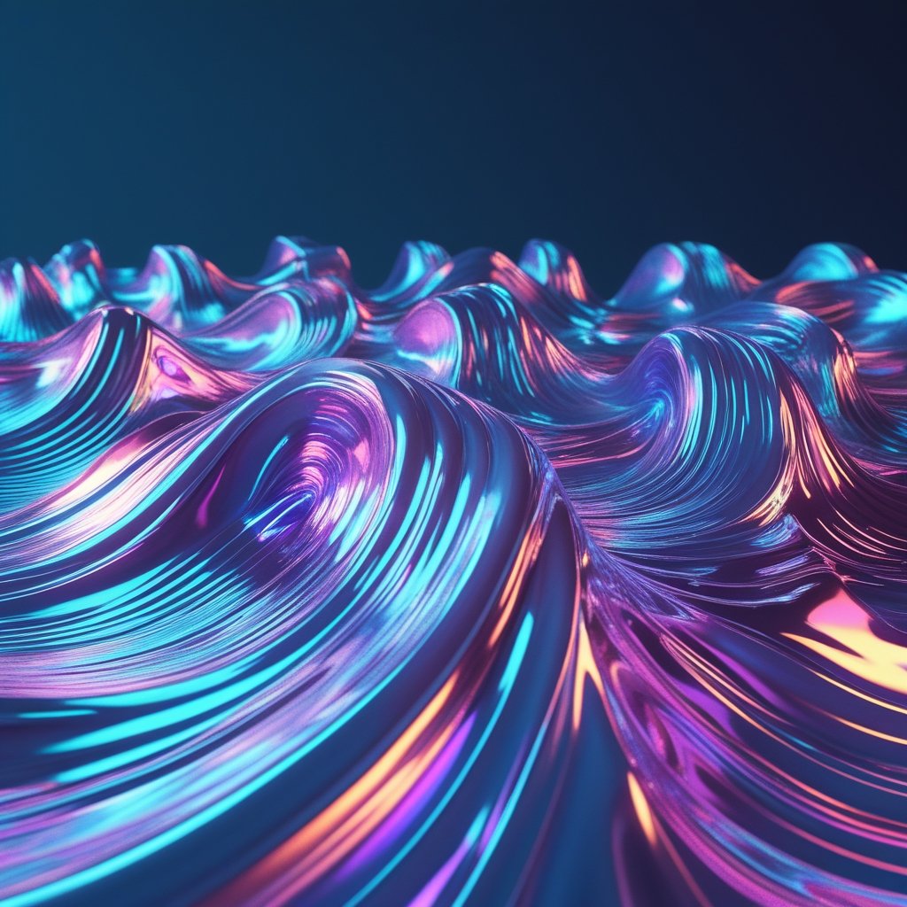 A mesmerizing digital artwork capturing a futuristic ocean of liquid metal waves, reflecting neon hues of blue, pink, and violet. The smooth, flowing surface creates a hypnotic effect, evoking a sense of motion and energy. A perfect NFT for collectors who appreciate fluid dynamics and cyberpunk aesthetics.