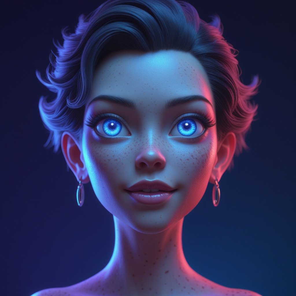 A futuristic portrait of a cybernetic muse, her glowing blue eyes radiate intelligence and mystery. Illuminated by soft neon hues, she embodies the perfect fusion of beauty and technology, a symbol of the evolving digital era.