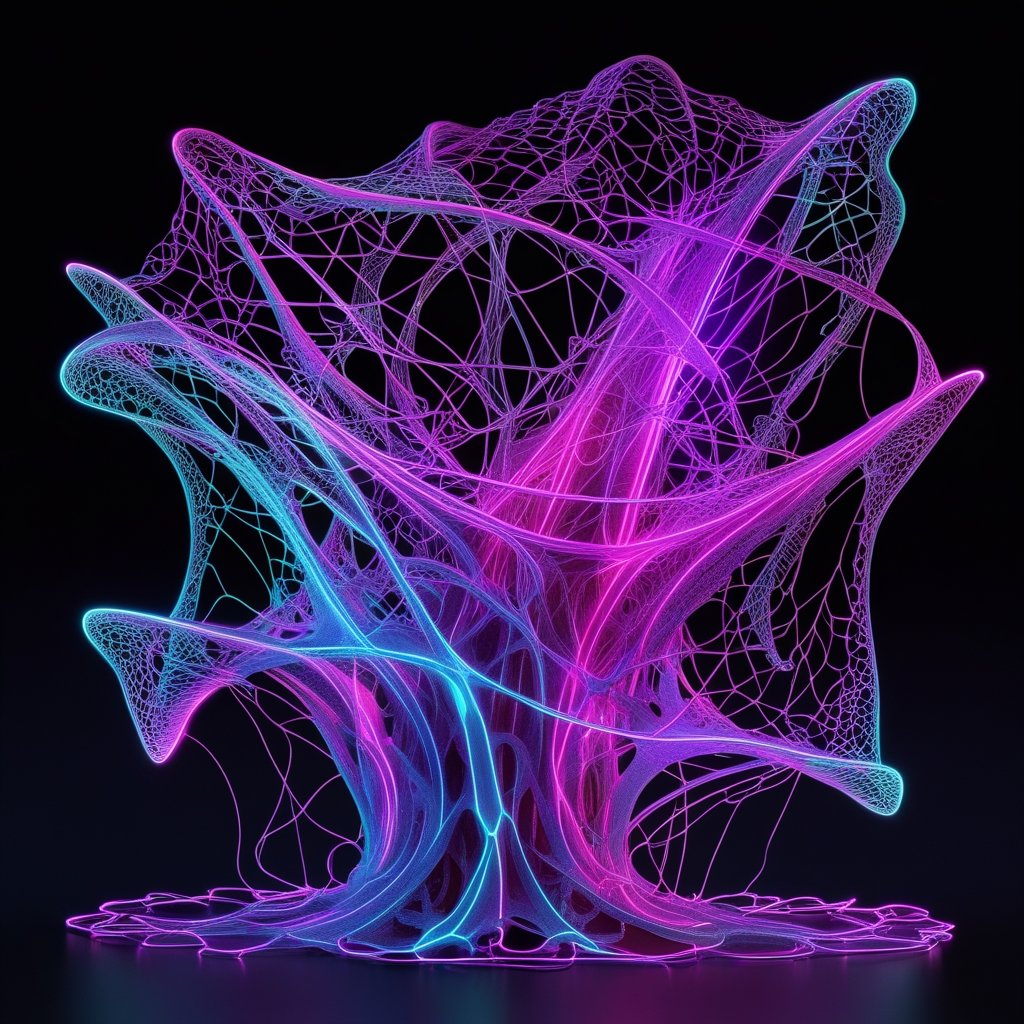 A stunning digital artwork featuring an intricate, glowing tree structure composed of an interconnected neon web of pink and blue energy. The delicate yet futuristic design resembles a fusion of organic growth and digital networks, symbolizing the intersection of nature and technology. This NFT is perfect for collectors who appreciate cyberpunk aesthetics, abstract geometry, and visionary digital art.