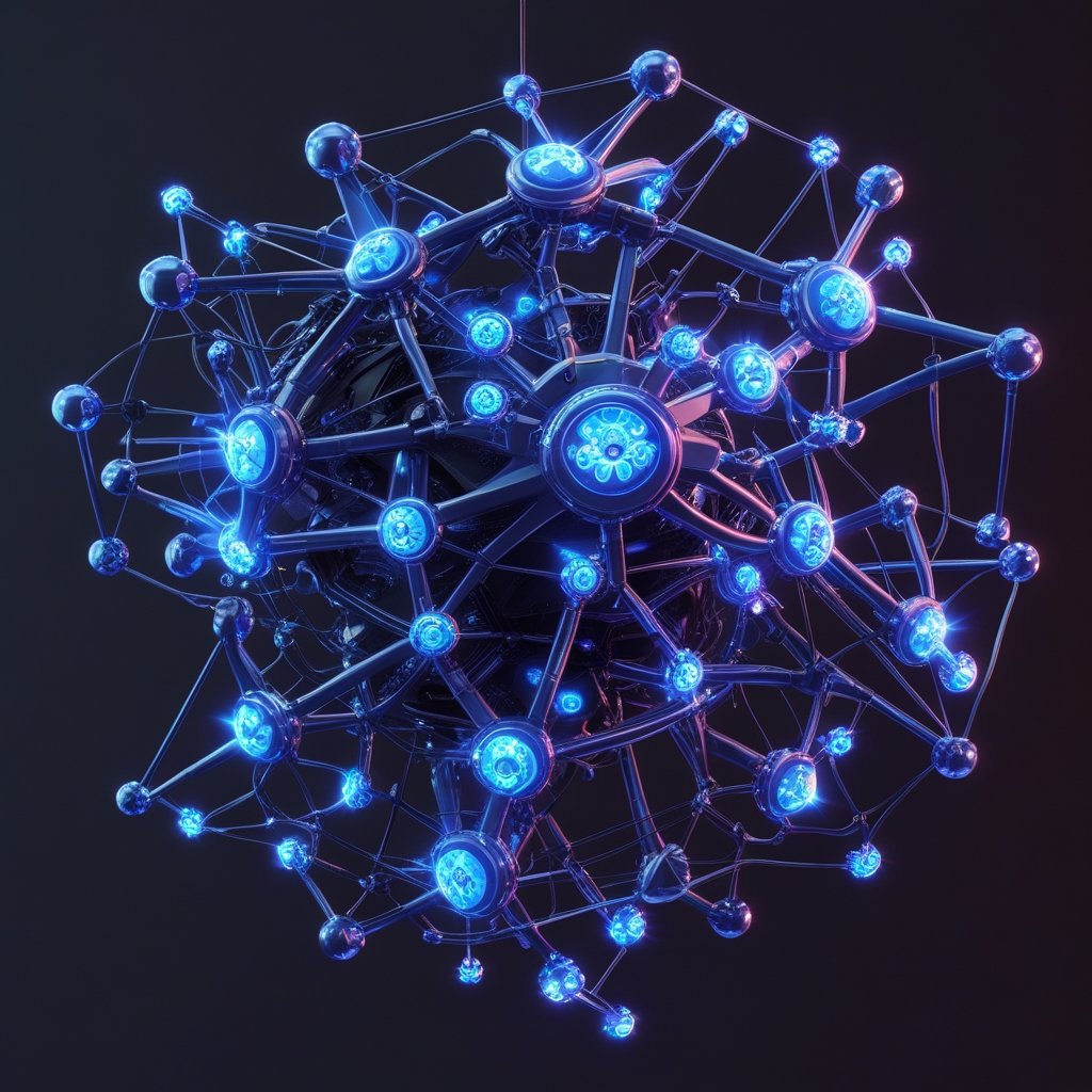 A futuristic AI-generated structure resembling an advanced neural network, glowing with electric blue energy. Intricately connected nodes and circuits form a mesmerizing web of intelligence, pulsating with life and data transfer. Suspended in space, this cybernetic core represents the fusion of technology and consciousness. Set against a solid dark background, its luminous energy shines with unmatched brilliance.