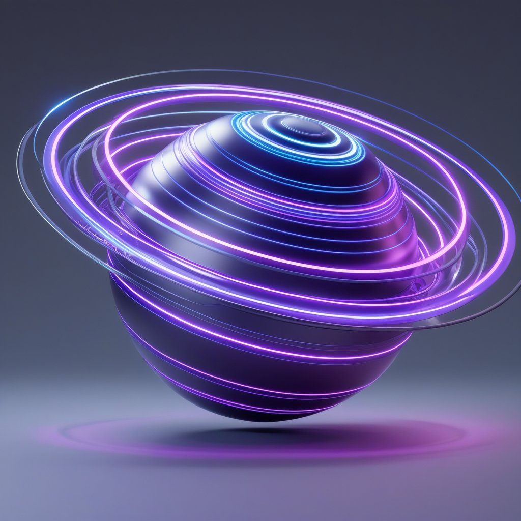 Orbital Pulse showcases a mesmerizing futuristic sphere surrounded by radiant neon rings in purple and blue hues. This artwork represents the rhythm of cosmic energy and the harmony of digital and celestial realms.