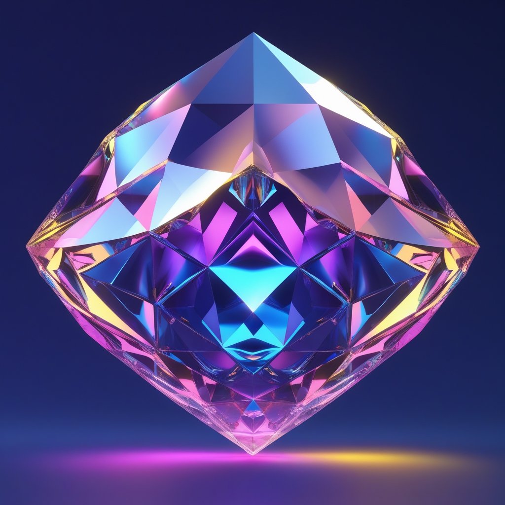 A radiant, multifaceted crystal floating in the void, refracting vibrant hues of blue, purple, and gold. This digital masterpiece captures the essence of cosmic energy and light refraction, making it a mesmerizing addition to any NFT collection.