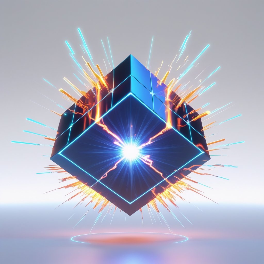 A mesmerizing digital artifact depicting a futuristic energy cube emanating vibrant bursts of light and power. Its sleek design and glowing details symbolize the convergence of energy, technology, and creativity.