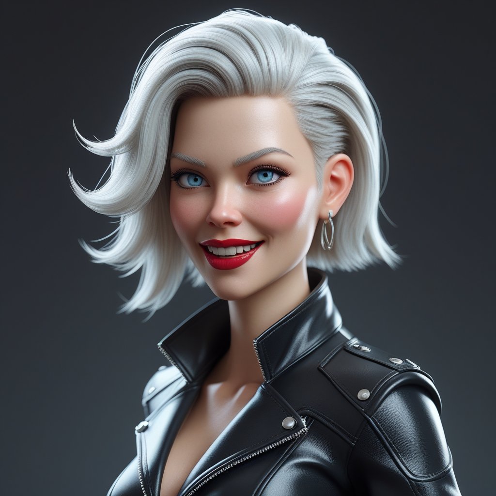 A striking fusion of elegance and attitude, this NFT captures the fearless essence of a modern icon. With her platinum blonde hair, piercing blue eyes, and confident smile, she commands attention. Clad in a sleek black leather jacket, she embodies rebellion and sophistication, a perfect blend of classic and contemporary.