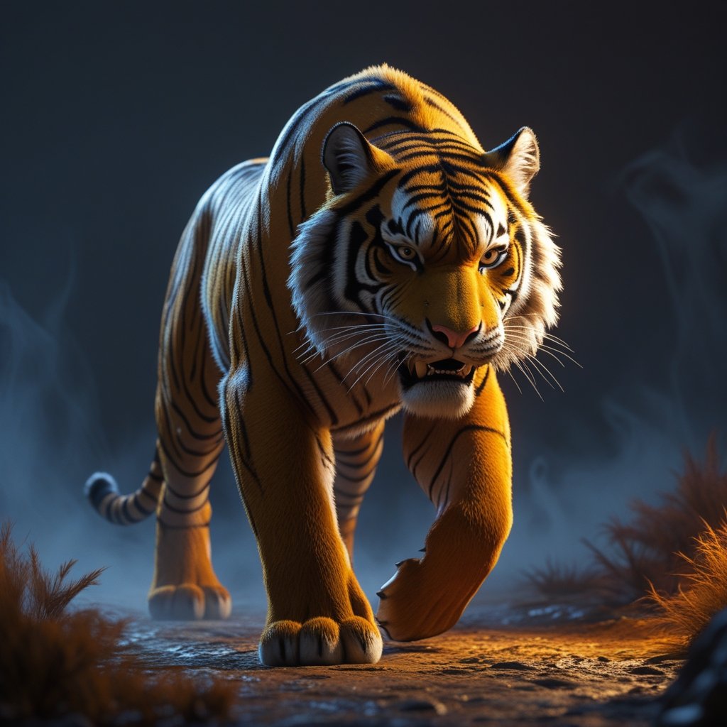 A fierce tiger emerging from the mist, its piercing eyes locked onto its prey. The dramatic lighting enhances its powerful stance, embodying both elegance and raw strength in the wild.