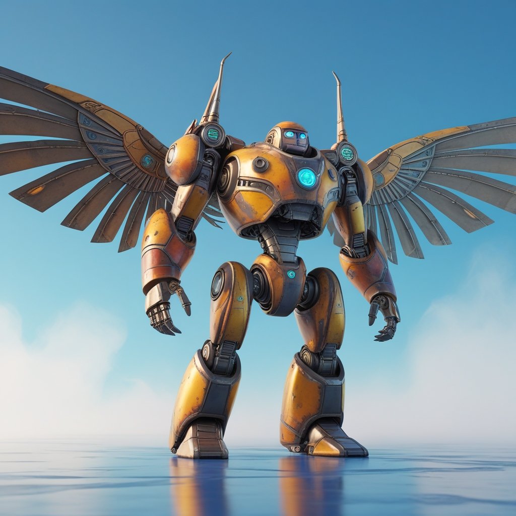 A majestic mechanical warrior with golden wings, standing as a guardian of the skies. Powered by advanced technology and celestial energy, this futuristic sentinel embodies both strength and grace. This NFT represents protection, innovation, and the fusion of machine and mythology.