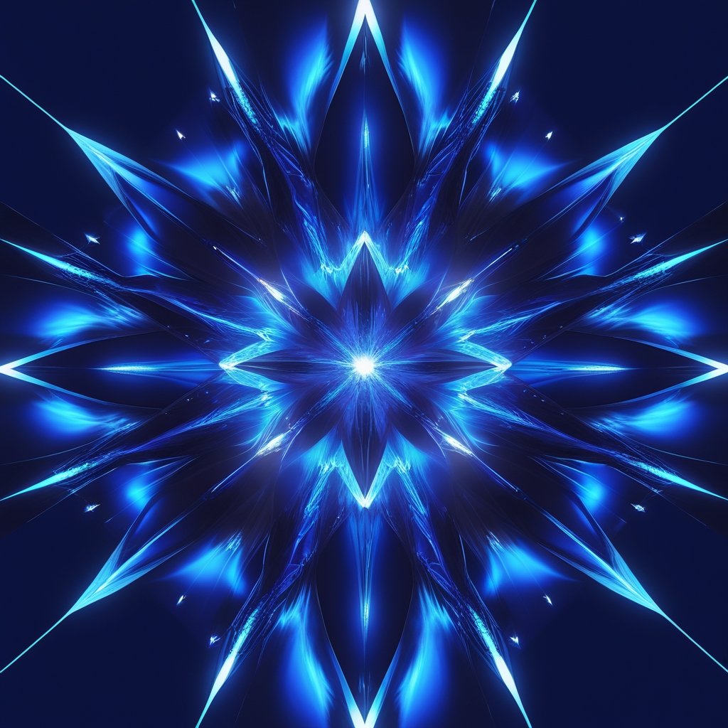 A mesmerizing fractal explosion radiating with electric blue energy, forming an intricate symmetrical pattern reminiscent of a cosmic starburst. The glowing shards extend outward, creating an ethereal sense of movement and infinite expansion. This digital masterpiece embodies the fusion of mathematical precision and celestial beauty. Set against a deep dark blue background, its luminous intensity captivates the eye.