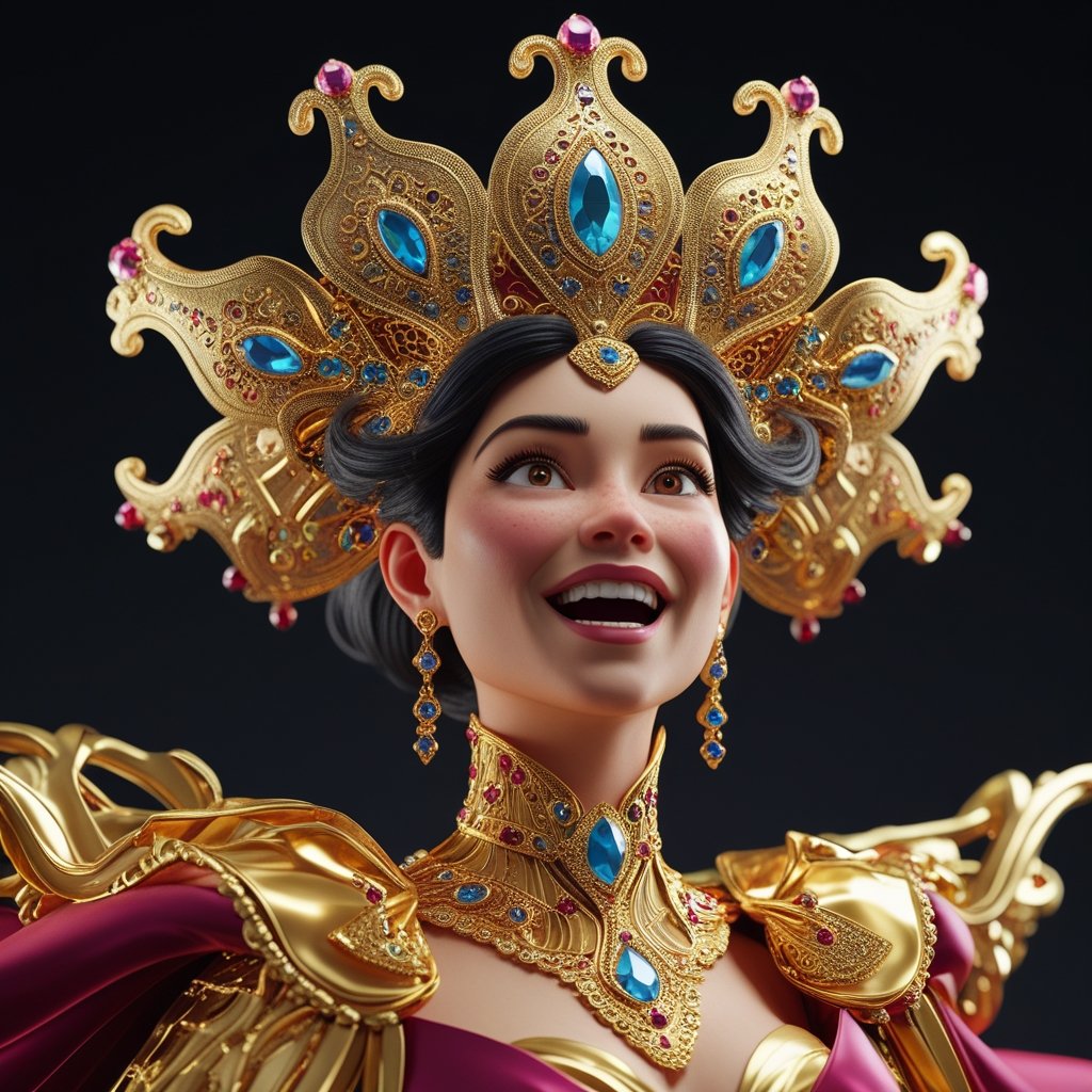 A mesmerizing digital artwork of a regal queen adorned in a breathtaking golden crown encrusted with sapphire and ruby gemstones. Her joyful expression and elegant attire symbolize power, grace, and divine beauty. This NFT captures the essence of royalty in a fantasy-inspired world.