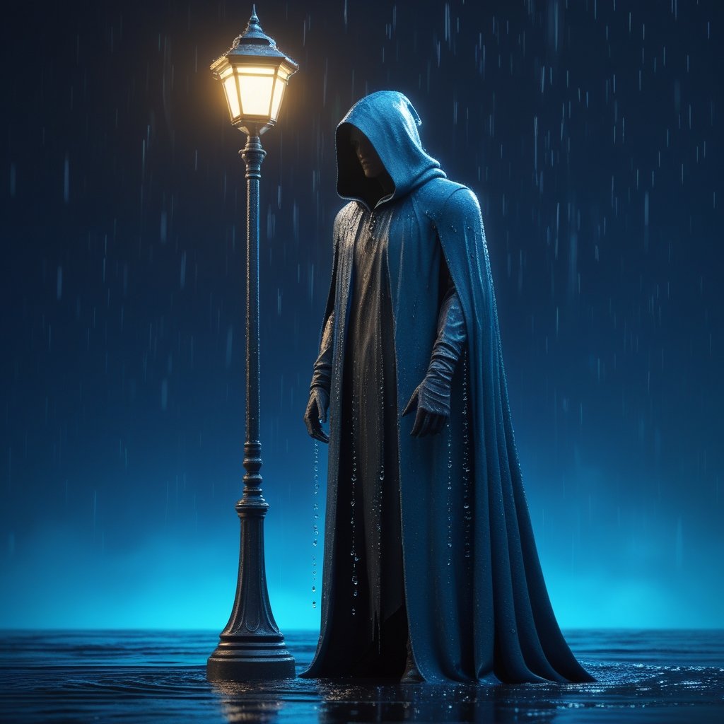 A mysterious hooded figure stands beneath a lone streetlamp on a rainy night. The cold blue tones contrast with the warm glow of the lamp, creating an eerie and cinematic atmosphere. Who is this cloaked wanderer, and what secrets do they carry?