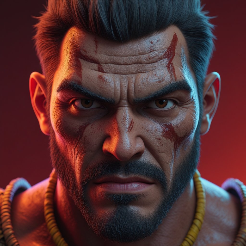 A striking close-up portrait of a battle-hardened warrior, his face marked with scars and war paint. His intense gaze and strong features reflect a lifetime of struggle, resilience, and unyielding determination.