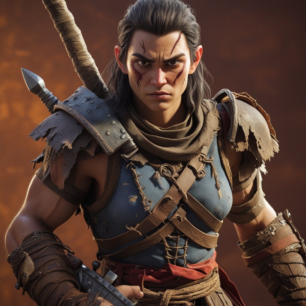 A battle-hardened rogue, scarred by countless fights, emerges from the ruins of a fallen world. Clad in tattered armor and wielding a deadly blade, he is a lone warrior driven by vengeance and survival.